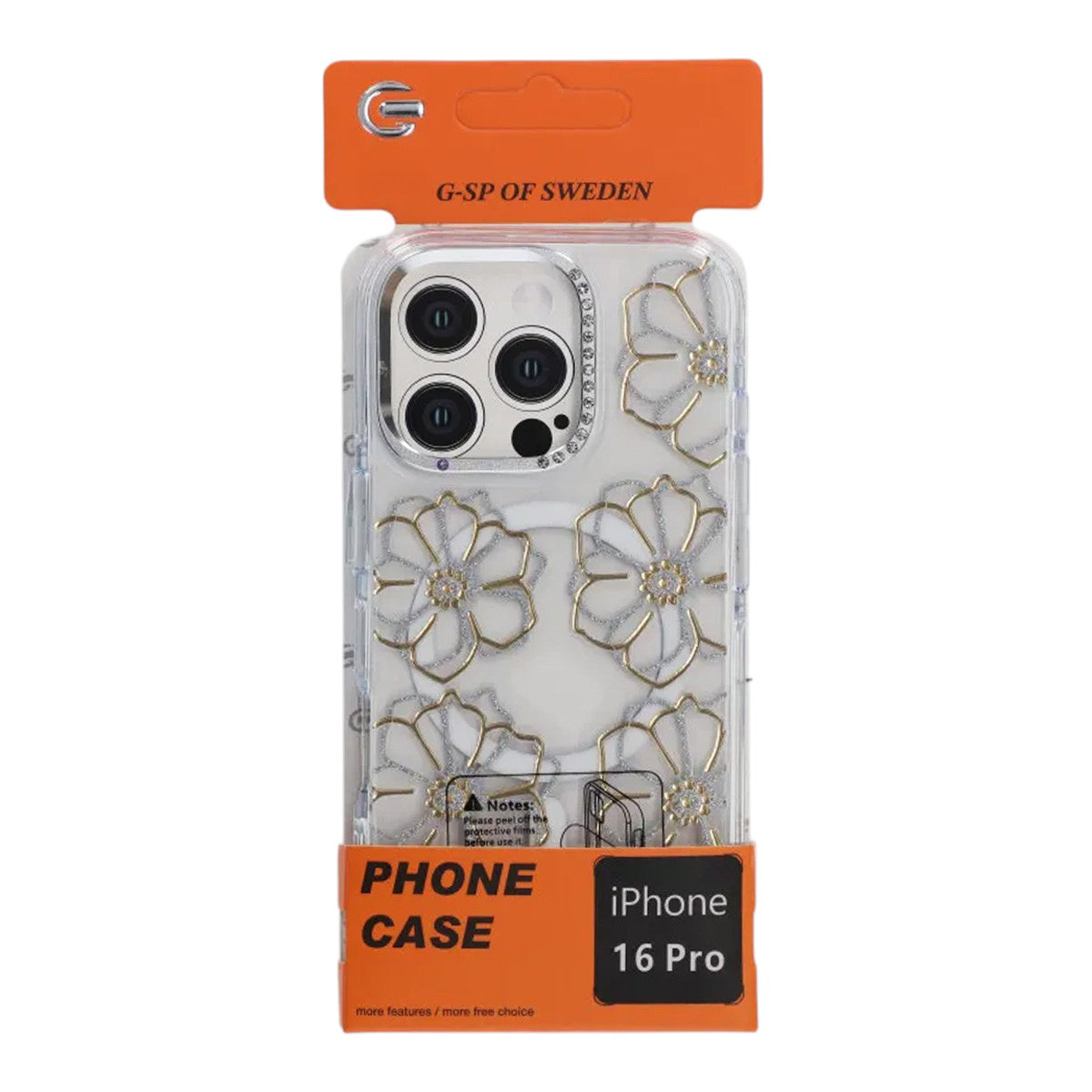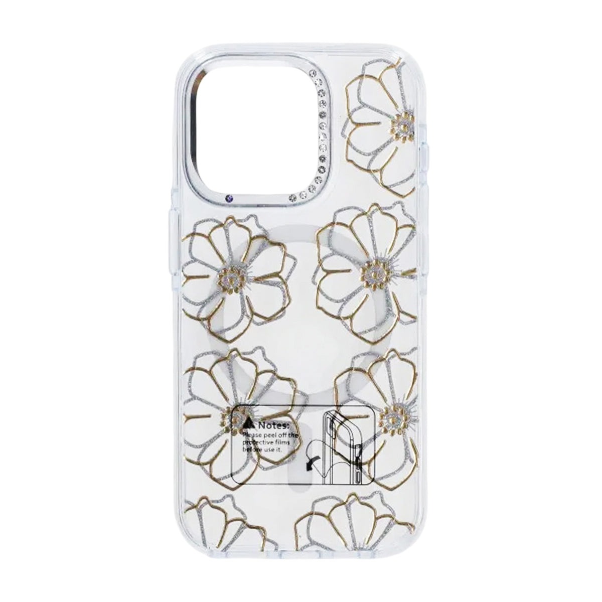 - Transparent mobilskal med guldiga blommor