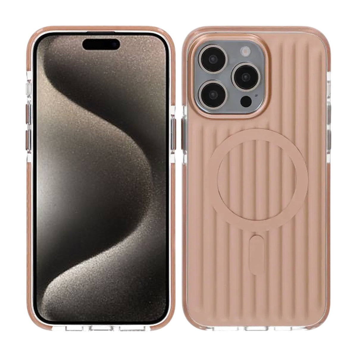 Den korrugerade baksidan i guld ger både unikt utseende och förbättrat grepp, samtidigt som MagSafe-kompatibilitet gör trådlös laddning smidig och stabil.