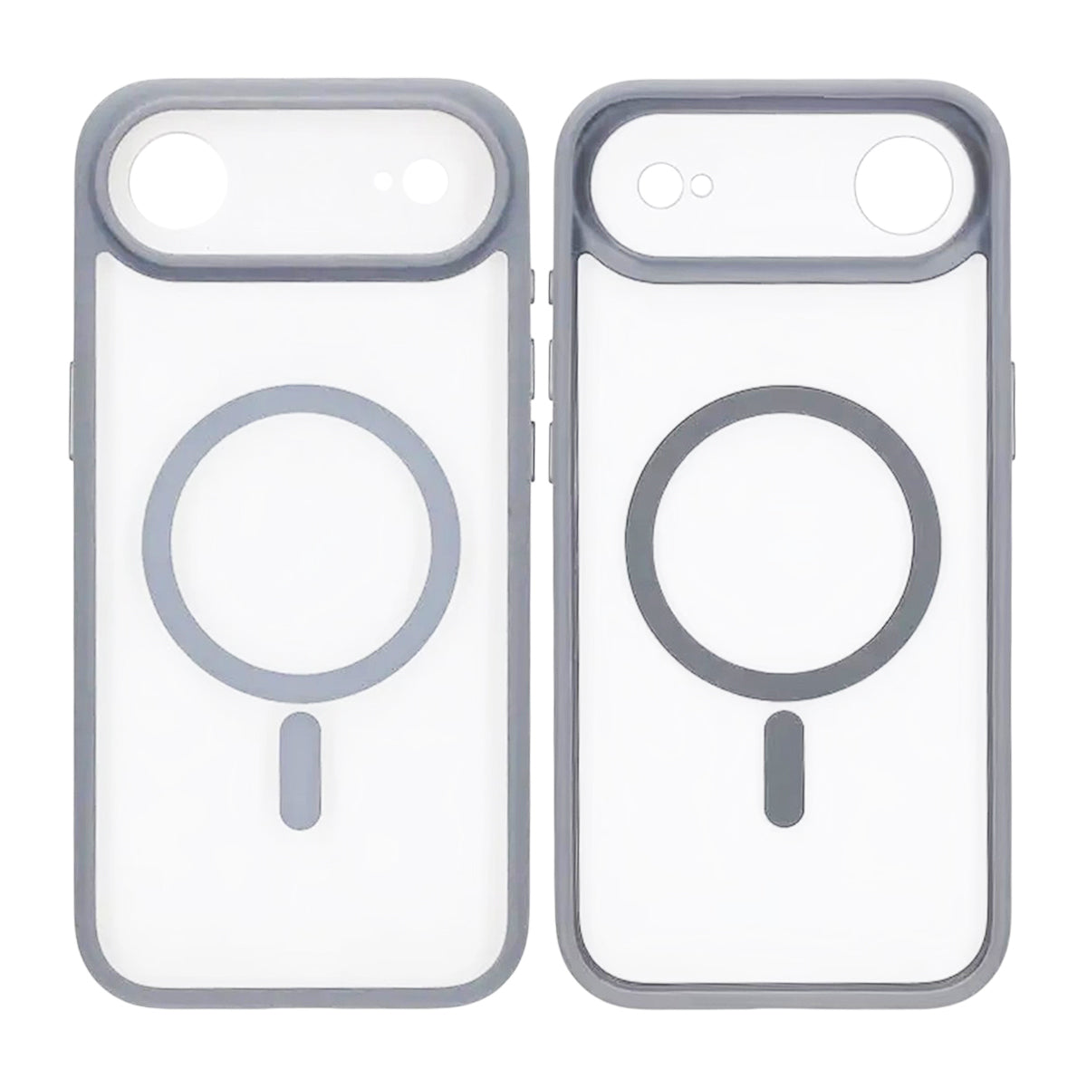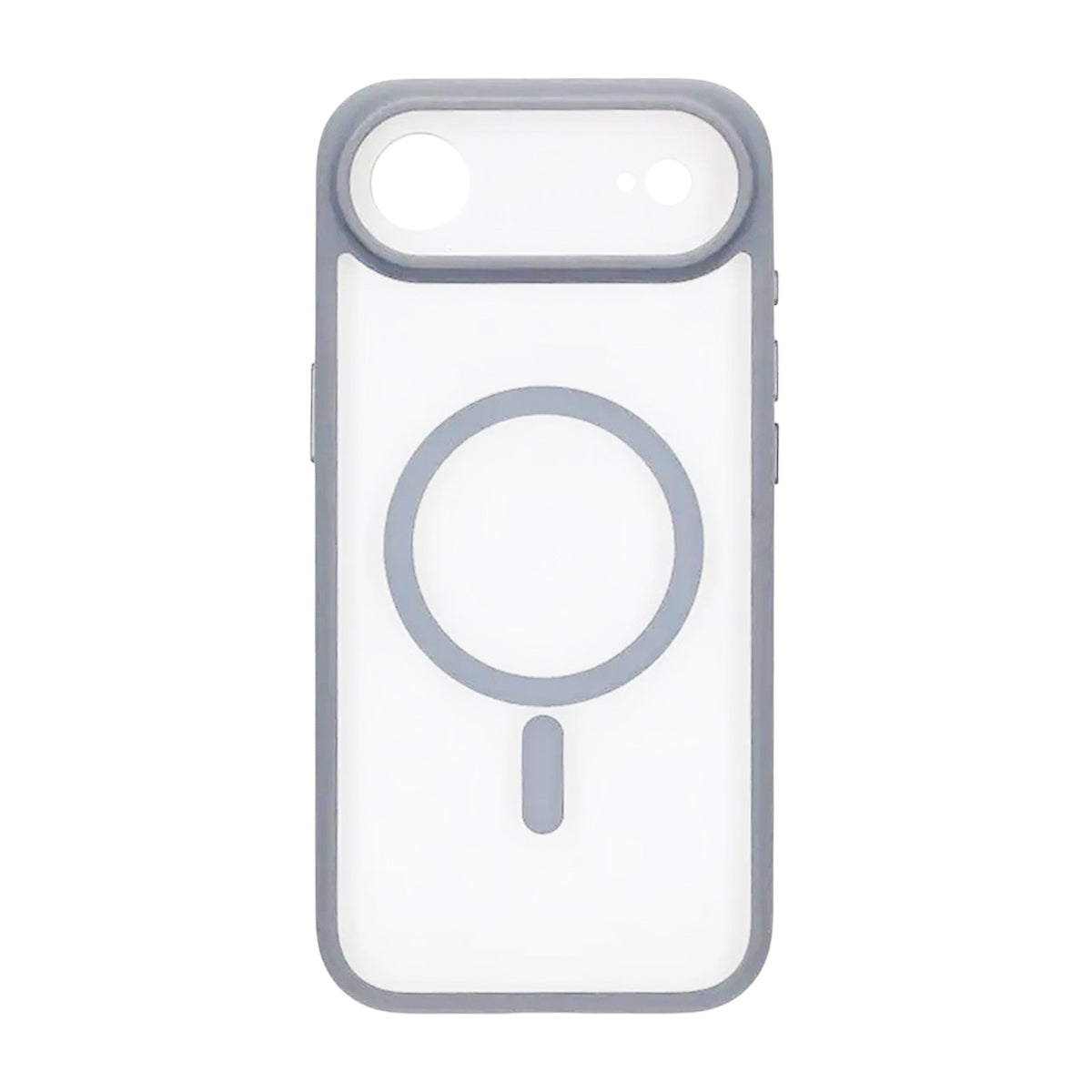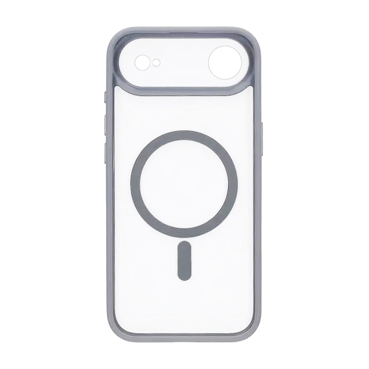 Ett robust grått hybridskal för iPhone Air som kombinerar TPU runt kanterna med en styvare, transparent baksida. Den integrerade MagSafe-ringen ger säkert fäste för laddare och magnetiska tillbehör, medan den förstärkta kameraramen med precisa utskärningar skyddar kameralinserna från repor och stötar.